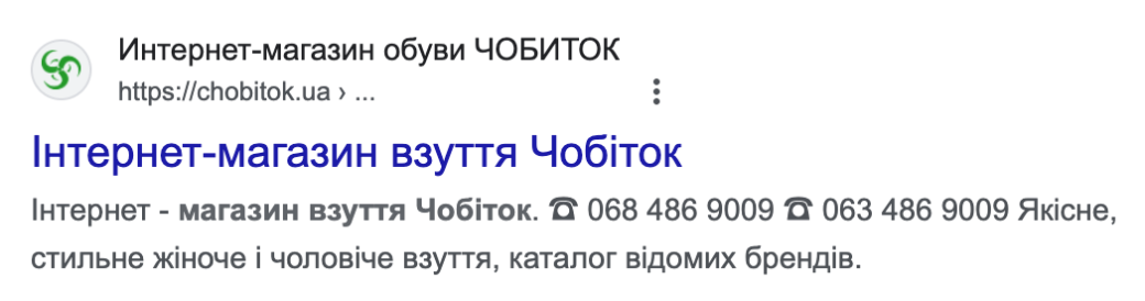 У цьому прикладі “інтернет-магазин взуття” – це не просто назва, це ключова фраза, за якою сайт може просуватися.